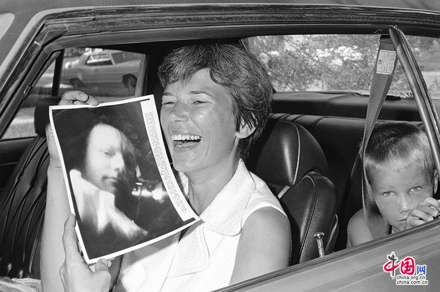 1969年7月18日,阿姆斯特朗的夫人简 阿姆斯特朗在车中观看丈夫从月球传回的照片,后座中是他们6岁的儿子马克。
