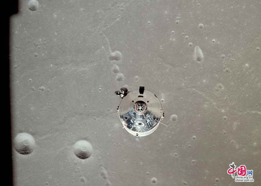 图为指令舱哥伦比亚号。图中可见月表上几处环形山。