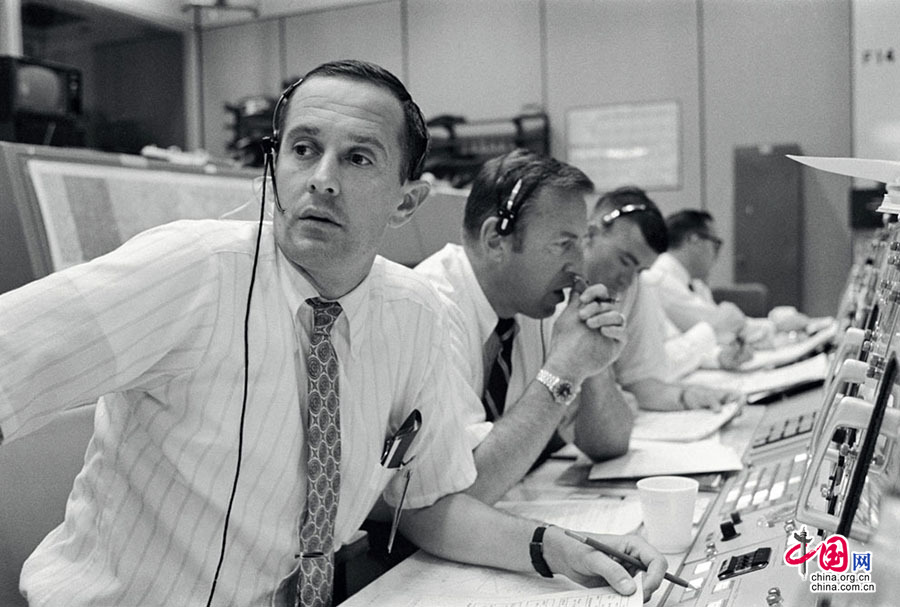 1969年7月20日,本次任务的替补成员以及支持团队人员与正在执行登月任务的宇航员联络,从左至右为查尔斯 杜克、吉姆 洛弗尔和弗莱德 海斯。