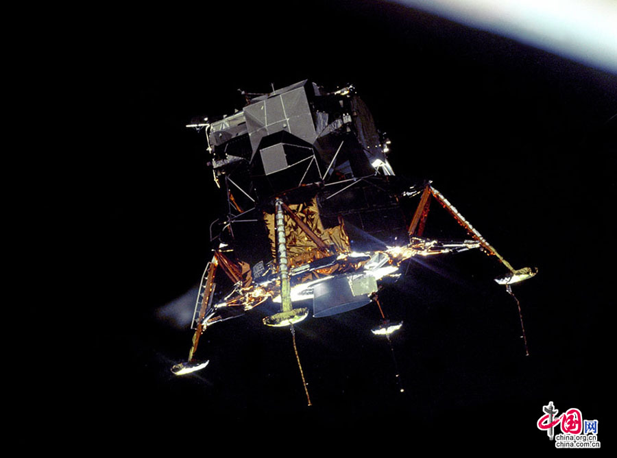 图为指令舱哥伦比亚号拍摄的登月舱鹰号即将登月时的照片。登月舱着陆腿下下垂的几根线状物为月表传感探头。当它与月表接触时,会提醒宇航员关闭着陆引擎。