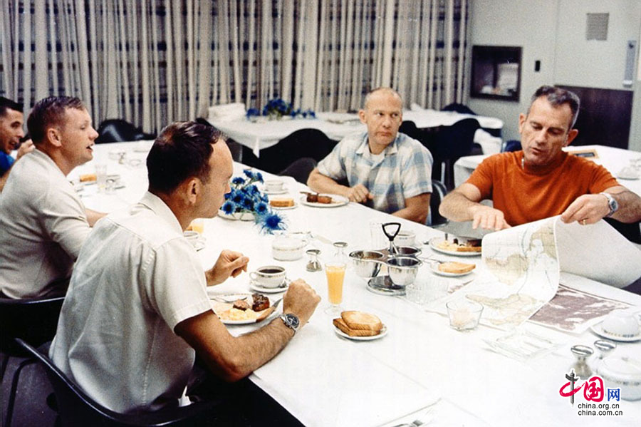 1969年7月16日即发射日当天,阿波罗11号任务组和空军上校迪克·斯雷顿共进早餐,他们吃了牛排和鸡蛋。