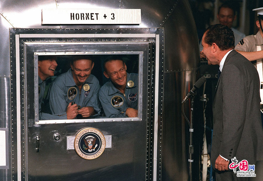 尼克松总统亲自登上了回收船——大黄蜂号航空母舰——欢迎宇航员返回地球。为隔绝从月球带回的未知病原体,阿波罗11号的乘员此时只能在隔离设施内与尼克松及世人交流。宇航员们于7月24日返回地球,距回收船大黄蜂号只有12海里(13.8英里)。