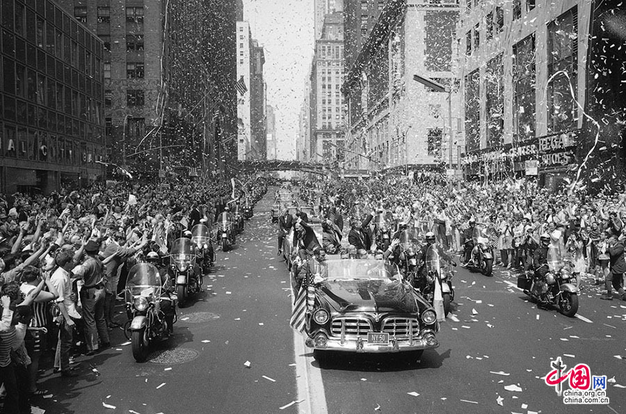 1969年8月13日,纽约第42号街。人们为阿波罗11号宇航员欢呼。坐在车辆头排的三位宇航员由左至右为:奥尔德林、柯林斯和阿姆斯特朗。当日,宇航员们离开了隔离区并接受美国民众的欢呼,同一天在纽约、芝加哥和洛杉矶都进行了为他们庆祝的游行。