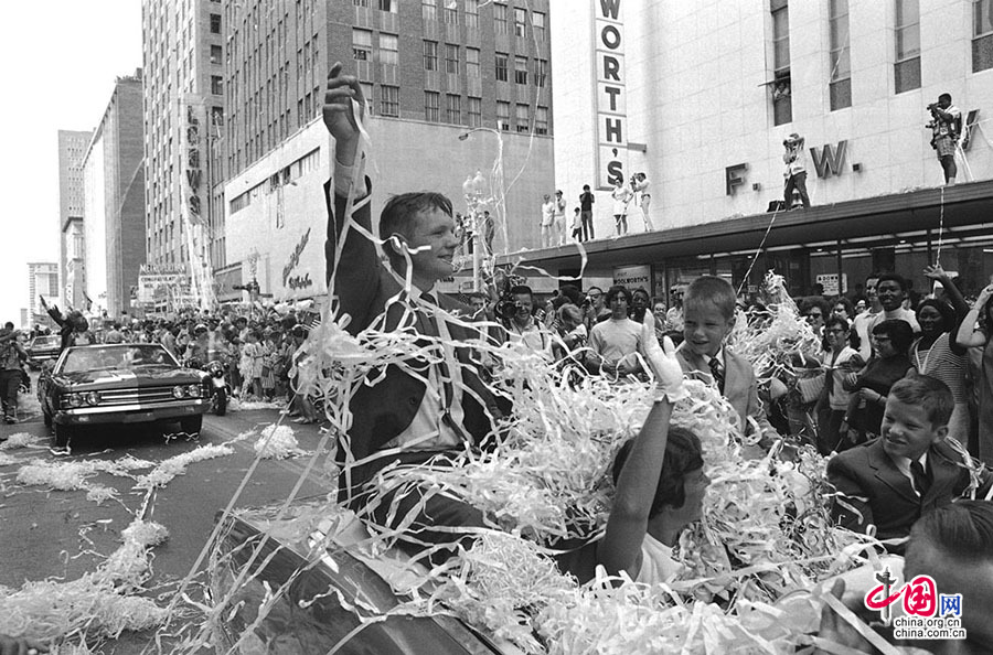 1969年8月16日,德克萨斯州休斯顿。人们用向天空扔洒彩色纸条,向驰过大街的阿姆斯特朗和他的夫人及两个儿子致敬欢呼。