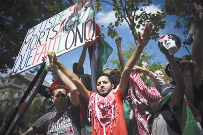 7月26日,法国巴黎,支持巴勒斯坦的抗议者们高举条幅,抗议以色列对加沙地带的军事行动。近期,欧洲各国爆发多起抗议以色列的示威游行。