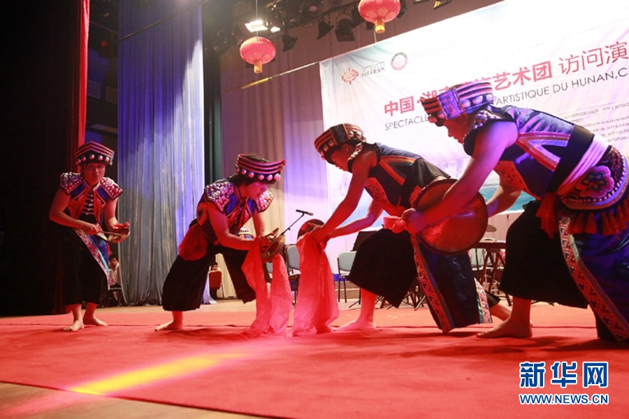 湖南民族艺术团表演湘西打溜子《八哥洗澡》。 (贝宁中国文化中心供图 摄影:西哈凡)