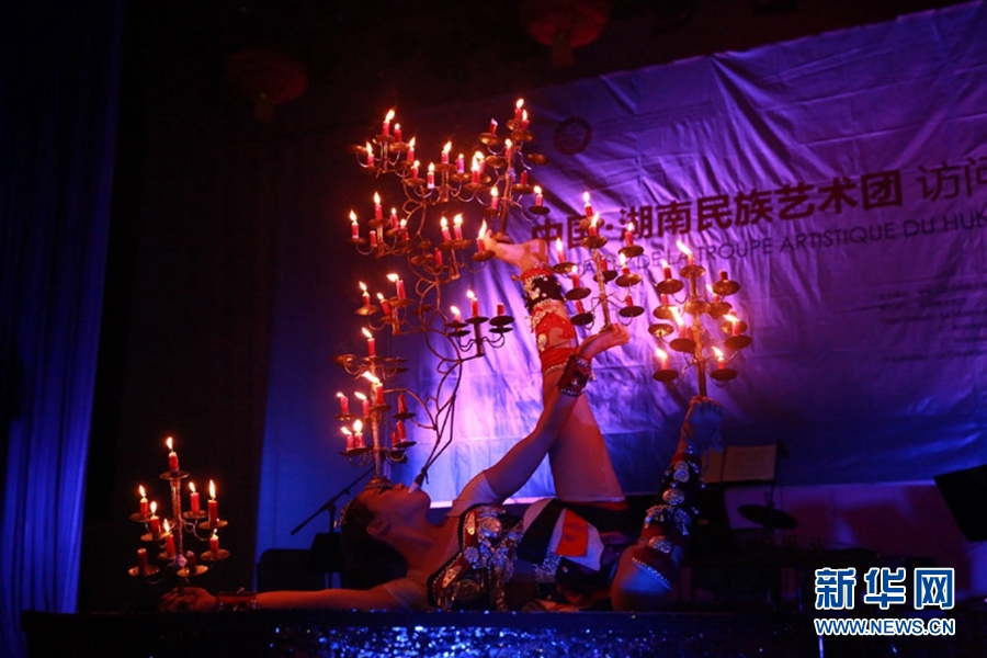 湖南民族艺术团表演杂技《滚灯》。 (贝宁中国文化中心供图 摄影:西哈凡)