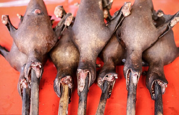 在市场里,塑料桌上摆着一堆火上叉烧过的蝙蝠,笼子里的狗等待着在泥泞的人行道上被灼烧的悲惨命运。此外,其他刺激食客神经的东西还有腌制的老鼠、猪腿和被开膛破肚露着内脏的烤蜥蜴等。