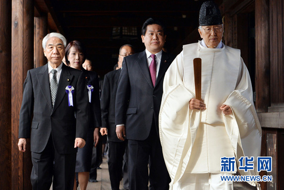 在日本东京,一名祭司带领多名国会议员参拜靖国神社(2013年10月18日摄)。
