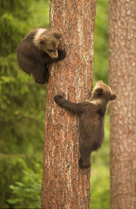 原标题:芬兰棕熊幼崽趁熊妈打盹顽皮爬树(组图)
