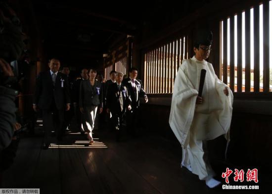 资料图:东京都九段北靖国神社今年4月21日开始为期3天的靖国神社春季大祭活动。21日,日本首相安倍晋三、厚生劳动大臣田村宪久、众参两院议长山崎正昭、日本遗族会会长、前厚生劳动大臣尾辻秀久均供奉祭品。
