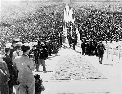 1945年10月10日,中国战区华北日军受降仪式在故宫太和殿广场举行。图为日军投降代表穿过观礼人群。当日军献刀时,群众山呼“中国万岁!中国万岁!” 资料图片