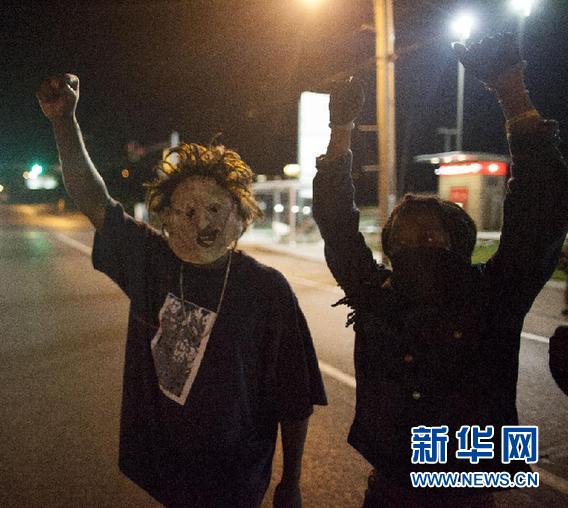 8月15日,在美国密苏里小城弗格森,两名头戴面罩的抗议者参加示威活动。 18岁黑人青年迈克尔·布朗9日下午同一个朋友在街上行走时,被一名警察连击数枪身亡。布朗当时没有携带武器,并且举起双手投降。此次事件引发抗议活动,并演变成骚乱,导致当地居民与警察严重对立。美国联邦调查局已经介入该事件调查。 新华社发(马库斯·迪保拉摄)