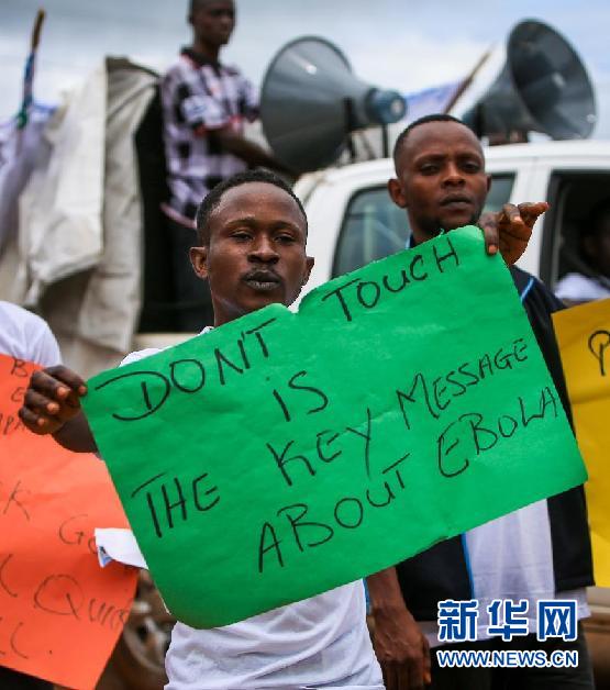 8月18日,塞拉利昂凯内马区理发师协会在街头宣传埃博拉防控。塞拉利昂约90%的埃博拉病毒感染病例都集中在该国东部省的凯内马区和疫情最初暴发地凯拉洪区,且都已被有效隔离。塞拉利昂卫生部长米娅塔·卡格博说“现在的主要任务是使凯内马区和凯拉洪区的感染病例增速放缓,同时期待未来几周内继续加强潜在暴发疫情地区的医疗力量,确保不会出现新一轮大规模疫情暴发。” 新华社记者 孟晨光 摄