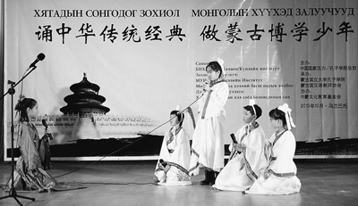 近年来,中蒙两国间文化交流与合作日益密切,蒙古国国内兴起学习汉语热。图为2013年10月举行的蒙古国第二届中学生中华典籍朗诵比赛现场。 本报记者 杨涛摄