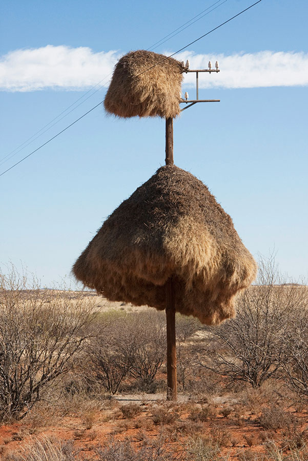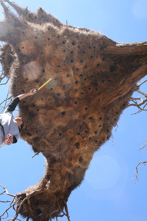 该鸟巢的搭建者是织雀科的拟厦鸟。加文推测,这些麻雀大小的鸟儿先用不同种类的小树枝编织鸟巢,然后用草、羽毛和棉花球划出一个个隔间。每个隔间都有单独的入口。一般一个隔间里会住三到四只鸟。
