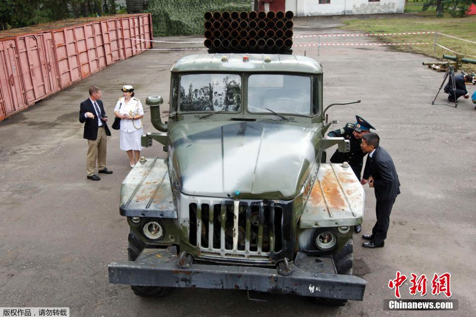 当地时间8月29日,乌克兰基辅,乌克兰政府向外国驻乌使馆武官展示在冲突中从民间武装手中缴获的武器和装备。