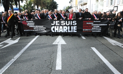 1月10日,法国尼斯,民众举着“我是查理”的标语游行,纪念在《查理周刊》恐袭案中的遇难者。