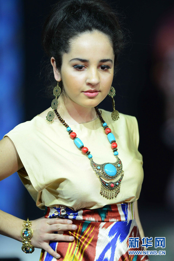 1月18日晚,乌兹别克斯坦塔什干国家艺术中心“扎尔海纳尔”,模特在展示乌兹别克斯坦传统服装。当晚,为期两天的乌兹别克斯坦2015民族手工艺术节在塔什干国家艺术中心“扎尔海纳尔”落下帷幕。闭幕式上,乌兹别克斯坦服装设计师们为观众展示出一系列精彩的最新民族服饰潮流时装展,艾提拉丝布和巴旦木花制作的传统服饰,更是把古老与现代艺术的质感和色彩融为一体,让在场观众大饱眼福。新华网记者 沙达提 摄