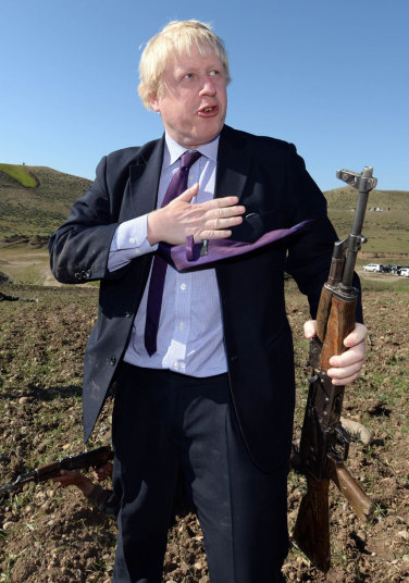 当地时间2015年1月22日,伦敦市长鲍里斯·约翰逊出访伊拉克,慰问正在前线附近训练库尔德自由斗士的英国军队。在伊拉克埃尔比勒,鲍里斯身着西装,趴在泥地上体验AK47步枪。试图展现英国与库尔德自由斗士一起齐心协力抵抗极端组织“伊斯兰国”的决心。