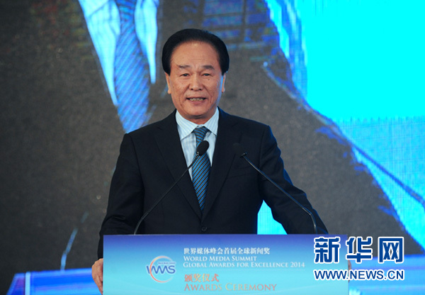 1月27日,世界媒体峰会首届全球新闻奖在北京举行颁奖仪式。图为新华社社长蔡名照致辞。 新华网 陈竞超 摄