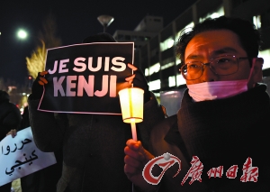 28日,日本民众手持“我是健二”的标语声援日本人质后藤健二。