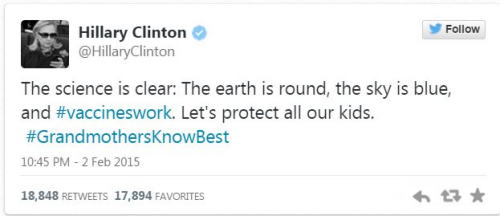 在希拉里的推特中,她使用了标签注明“疫苗有用”和“祖母总是知道的更多”,并写道,“科学证明了:地球是圆的,天空是蓝的,疫苗是有用的。让我们一起保护孩子。”