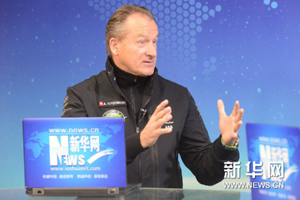 瑞士“阳光动力”CEO、“阳光动力2号”环球首飞飞行员安德烈·博尔施伯格在新华网接受访谈,新华网潘巧文 摄