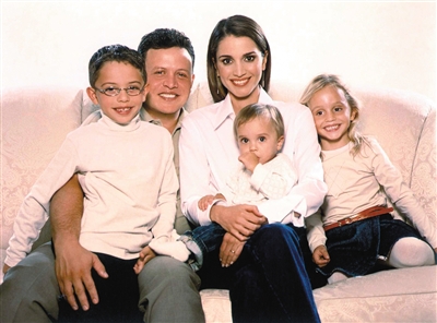 2003年,阿卜杜拉二世与拉尼娅王后结婚十周年时王室公布的照片。还有他们的三个孩子——侯赛因王子、伊曼公主和萨尔玛小公主。