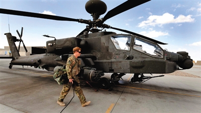 服役于英国皇家空军的哈里王子经过一架阿帕奇武装直升机。