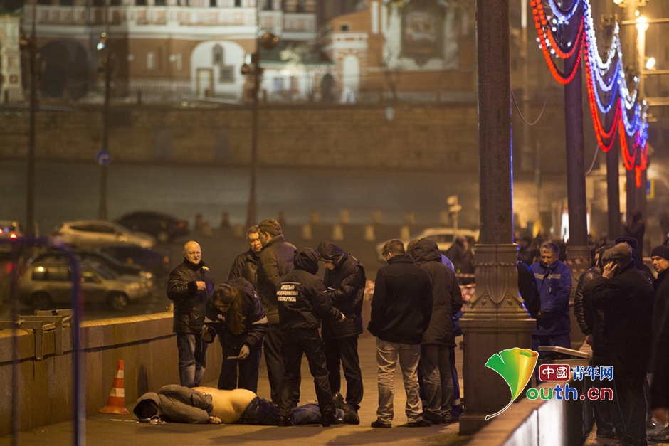 当地时间2015年2月28日,俄罗斯莫斯科,警察在鲍里斯-涅姆佐夫的尸体旁进行调查。据国外媒体报道,俄罗斯反对派政治家、前副总理鲍里斯-涅姆佐夫遭射杀身亡。据悉,事发时涅姆佐夫走在克里姆林宫附近的大街上,身份不明的凶手朝他开枪。涅姆佐夫在叶利钦在任时期曾任第一副总理,现猛烈批评总统普京,经常组织街头游行,并揭露官员贪腐,他原定在3月1号出席莫斯科一个反对派的大型游行。 图片署名:Pavel Golovkin/东方IC