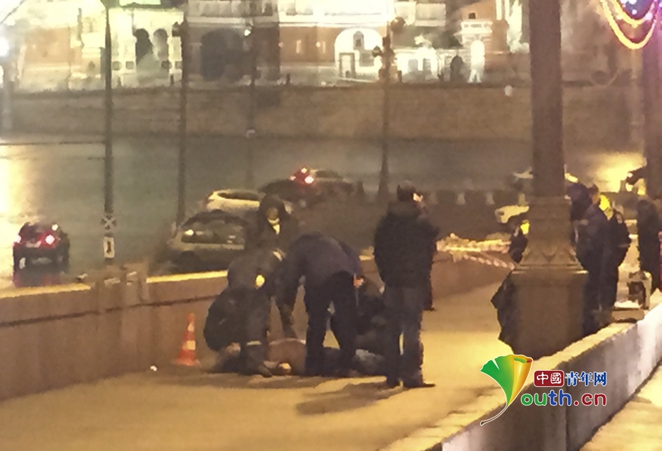 当地时间2015年2月28日,俄罗斯莫斯科,警察在鲍里斯-涅姆佐夫的尸体旁进行调查。据国外媒体报道,俄罗斯反对派政治家、前副总理鲍里斯-涅姆佐夫遭射杀身亡。据悉,事发时涅姆佐夫走在克里姆林宫附近的大街上,身份不明的凶手朝他开枪。涅姆佐夫在叶利钦在任时期曾任第一副总理,现猛烈批评总统普京,经常组织街头游行,并揭露官员贪腐,他原定在3月1号出席莫斯科一个反对派的大型游行。 图片署名:Pavel Golovkin/东方IC