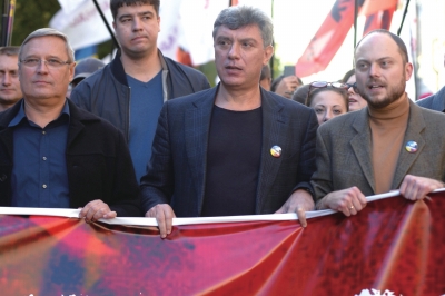 涅姆佐夫在莫斯科参加游行的资料照片(2014年9月21日摄)。新华社发