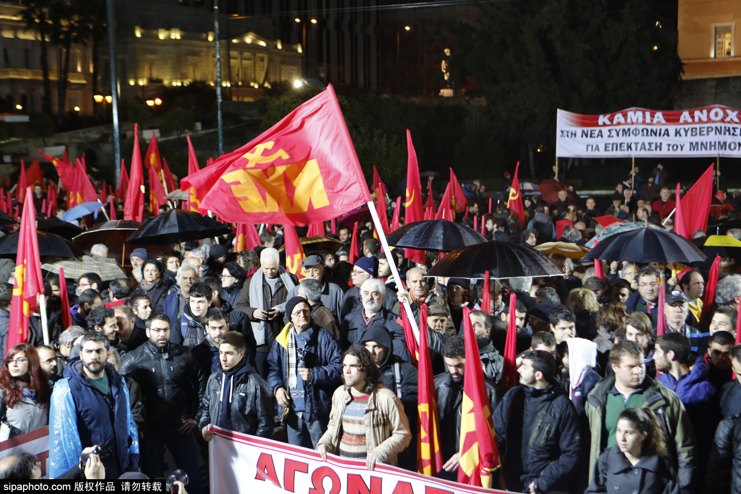当地时间2015年2月27日,希腊雅典,希腊共产党支持者高举红旗在希腊议会前举行反政府游行,反对希腊政府跟IMF和欧行签署关于希腊的国际外债协议。(图片来源:SIPA)