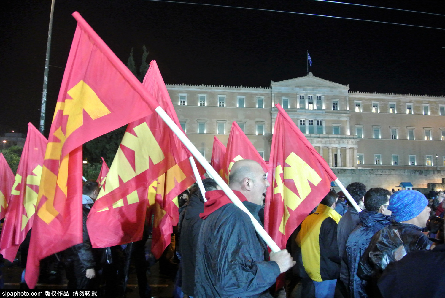当地时间2015年2月27日,希腊雅典,希腊共产党支持者高举红旗在希腊议会前举行反政府游行,反对希腊政府跟IMF和欧行签署关于希腊的国际外债协议。(图片来源:SIPA)