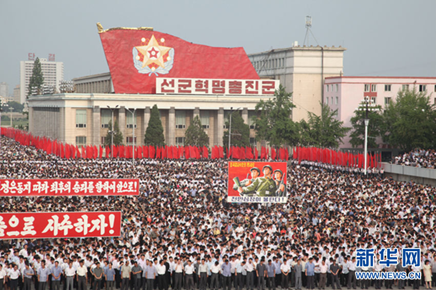 红旗下写着:先军革命总进军 新华社记者曾涛摄