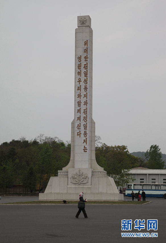 朝鲜大城山附近的永生塔,上面写着伟大的金日成同志和金正日同志永远和我们在一起 新华社记者曾涛摄