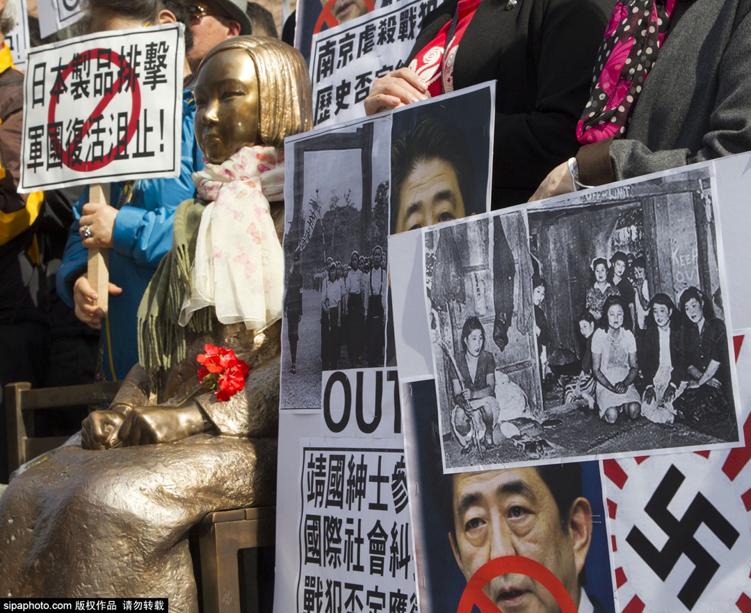 当地时间2015年4月1日,韩国首尔,民众聚集在日本驻韩使馆门前举行反日游行。