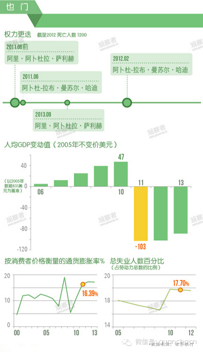 早在去年底,观察者网就整理各国数据,制作图说《阿拉伯之春四周年祭》。也门局势恶化后,CNN也制作图文专题反思:“看看阿拉伯革命曾波及的几个国家,看看革命给它们带了什么来吧。”专题梳理了也门、突尼斯、埃及、利比亚和叙利亚这五个国家革命前后的境况。