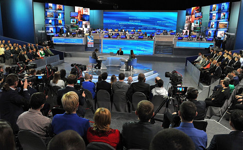 4月16日,俄罗斯总统普京参加与民众直播连线活动现场。