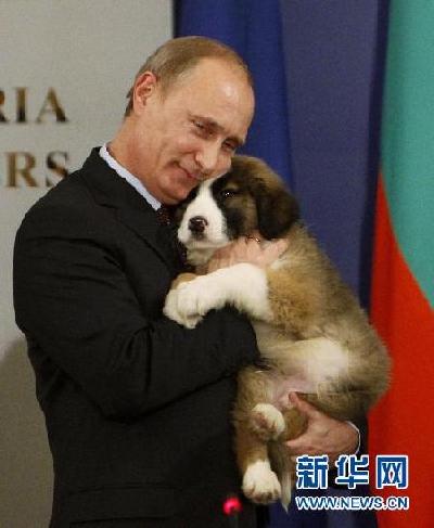 2010年11月13日,在保加利亚首都索菲亚,普京将保加利亚总理鲍里索夫赠送的保加利亚牧羊犬抱在怀中。资料图