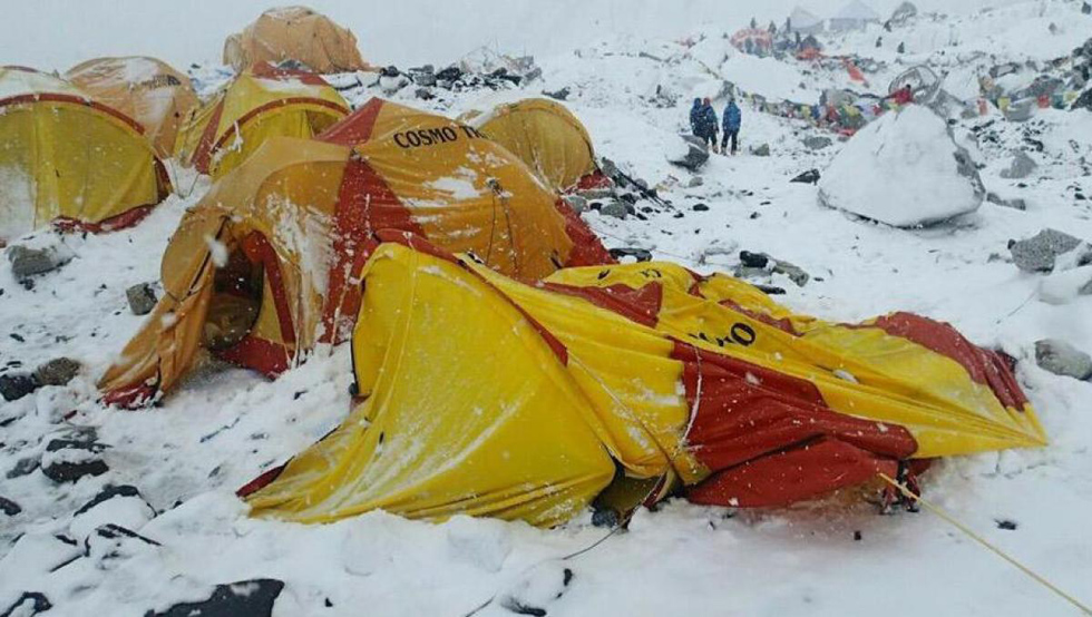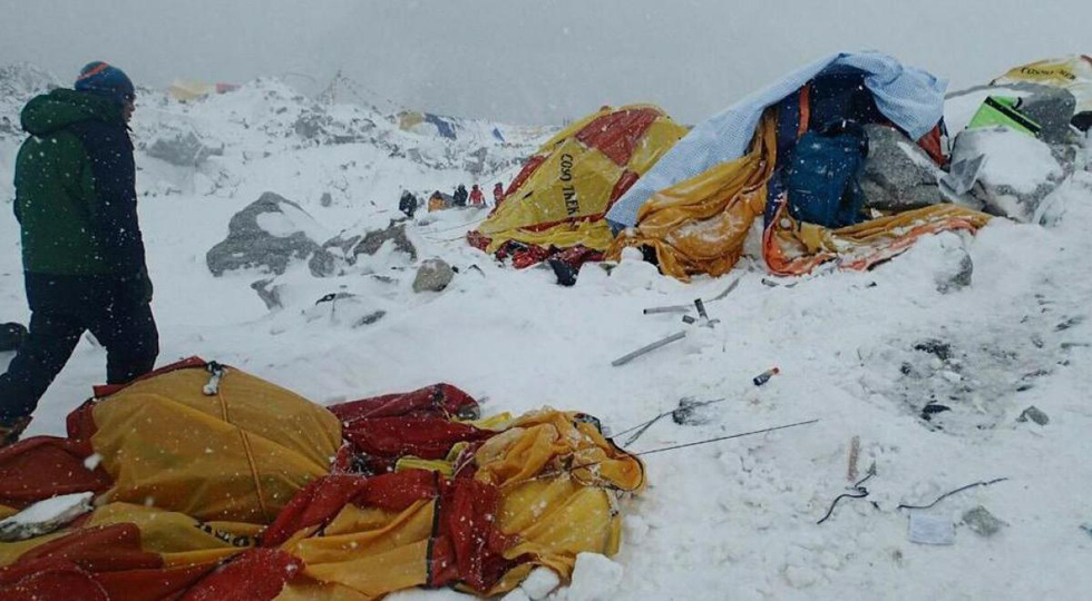 地震引发珠穆朗玛峰雪崩,许多在珠峰大本营帐篷里休息的登山者被埋雪下。(网页截图)