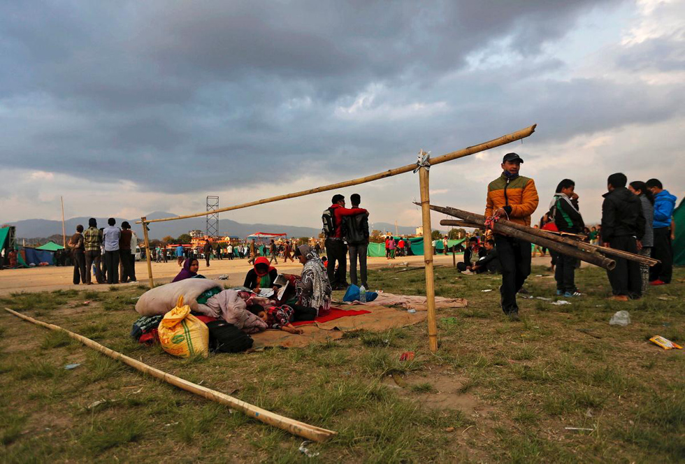 加德满都的当地居民用竹竿在开阔地搭帐篷。(网页截图)