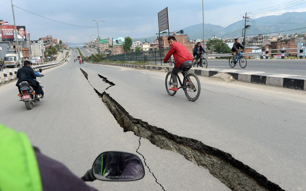 尼泊尔首都加德满都(Kathmandu)震后裂开的路面。国际救援组织正想尽办法进行补给和施救,但是山体滑坡与不稳定的传输信号导致救援工作面临巨大挑战。(网页截图)