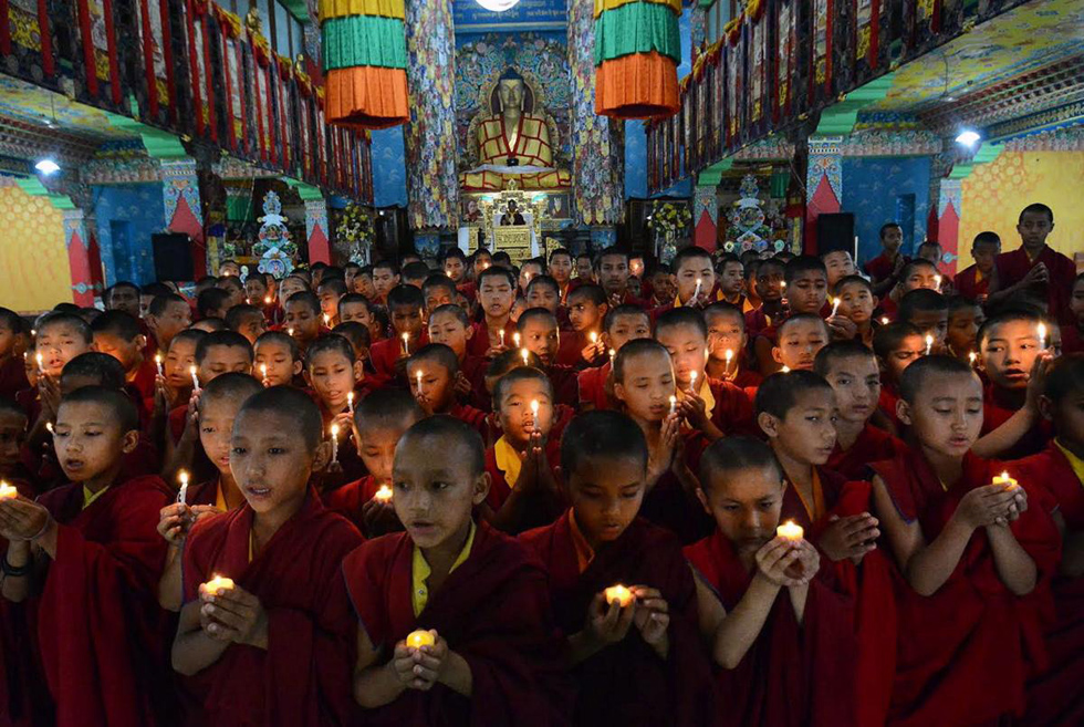 4月26日,尼泊尔小佛教徒在印度佛教圣地菩提迦耶的聚藏寺(Tergar