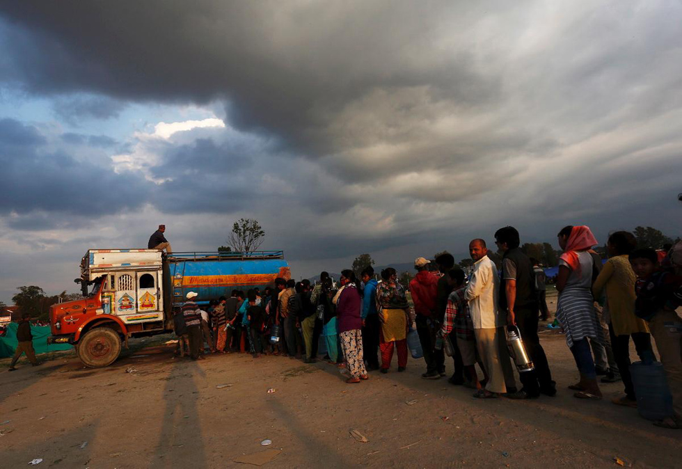 加德满都的当地居民在一辆供水车前排队打水。(网页截图)