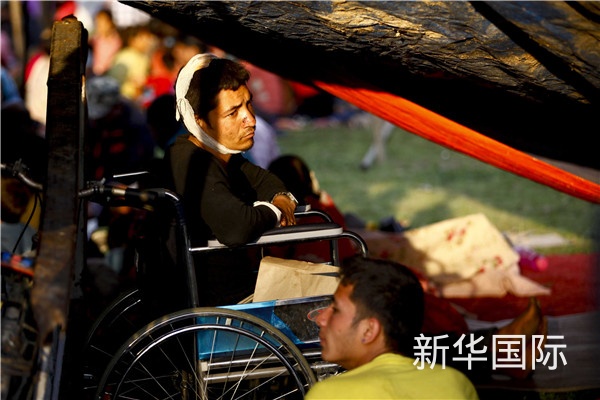 (图为2015年4月26日,在尼泊尔加德满都的敦迪凯尔广场,一名受伤男子在帐篷中休息。新华社发,普拉塔普·塔帕摄)
