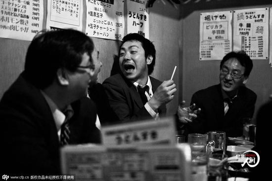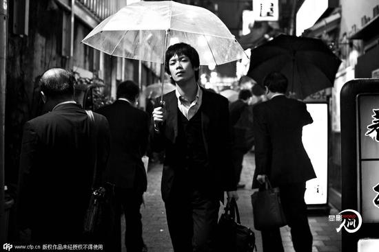 在休息时间,白领工人冒雨走在有很多当地小酒吧的地方。很多日本男性下班后即使实在无事可做也不会回家,要去小酒馆泡上几个钟头,喝得醉醺醺再回家。
