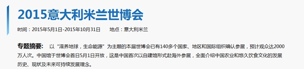 2015年意大利米兰世博会主题为“滋养地球,生命能源”,于5月1日至10月31日举办,共有148个国家和国际组织参展。本届世博会上,中国国家馆首次以自建馆形式赴海外参展。