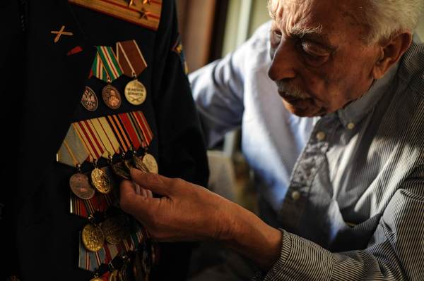 为了弄清俄罗斯老兵胸前这五花八门的勋章奖章,记者特地登门拜访了一位二战老兵——93岁的莫斯科东区老兵协会主席马克·伊万尼欣,请他来个“现身说法”。
